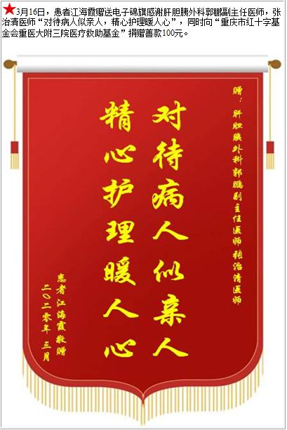 患者江海霞赠送电子锦旗感谢肝胆胰外科郭鹏副主任医师等人,并向医疗救助基金捐赠善款100元-锦旗-患者心声-患者服务-重庆医科大学附属第三医院【官方网站】