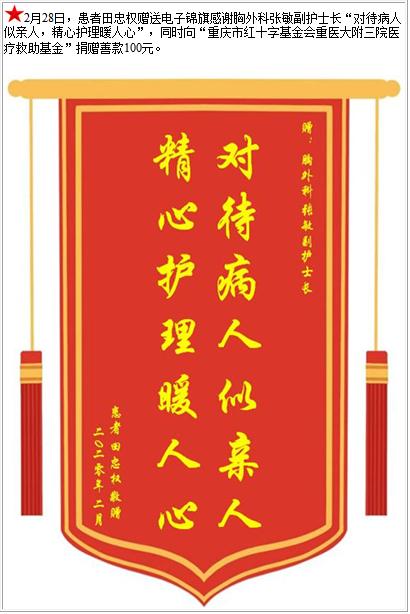 患者田忠权赠送电子锦旗感谢胸外科张敏副护士长,并向医疗救助基金捐赠善款100元-锦旗-患者心声-患者服务-重庆医科大学附属第三医院【官方网站】