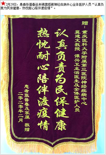 患者张普春送来锦旗感谢神经疾病中心全体医护人员“认真负责为民保健康,热忱耐心陪伴渡疫情”-锦旗-患者心声-患者服务-重庆医科大学附属第三医院【官方网站】