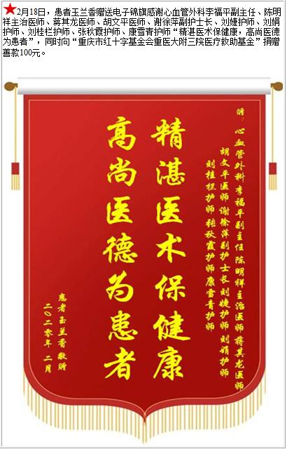 患者玉兰香赠送电子锦旗感谢心血管外科李福平副主任等人,并向医疗救助基金捐赠善款100元-锦旗-患者心声-患者服务-重庆医科大学附属第三医院【官方网站】