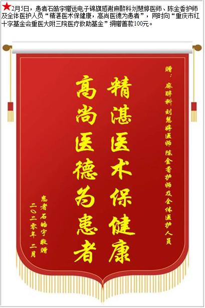 患者石皓宇赠送电子锦旗感谢麻醉科刘慧婷医师等人及全体医护人员,并向医疗救助基金捐赠善款100元-锦旗-患者心声-患者服务-重庆医科大学附属第三医院【官方网站】