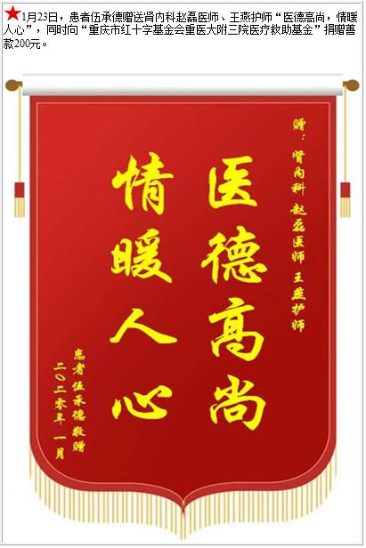 患者伍承德赠送肾内科赵磊医师等人,并向医疗救助基金捐赠善款200元-锦旗-患者心声-患者服务-重庆医科大学附属第三医院【官方网站】