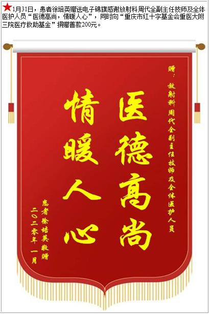 患者徐培英赠送电子锦旗感谢放射科周代全副主任技师及全体医护人员,并向医疗救助基金捐赠善款200元-锦旗-患者心声-患者服务-重庆医科大学附属第三医院【官方网站】