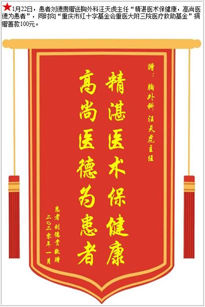 患者刘德贵赠送胸外科汪天虎主任,并向医疗救助基金捐赠善款100元-锦旗-患者心声-患者服务-重庆医科大学附属第三医院【官方网站】