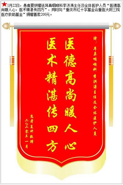患者夏妍赠送耳鼻咽喉科李洪涛主任及全体医护人员,并向医疗救助基金捐赠善款200元-锦旗-患者心声-患者服务-重庆医科大学附属第三医院【官方网站】