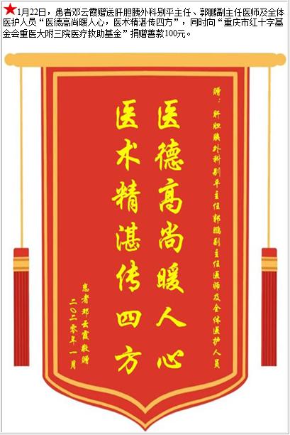患者邓云霞赠送肝胆胰外科别平主任等人及全体医护人员,并向医疗救助基金捐赠善款100元-锦旗-患者心声-患者服务-重庆医科大学附属第三医院【官方网站】