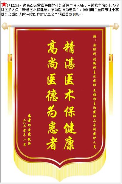 患者邓云霞赠送麻醉科刘新伟主任医师等人及全科医护人员,并向医疗救助基金捐赠善款100元-锦旗-患者心声-患者服务-重庆医科大学附属第三医院【官方网站】