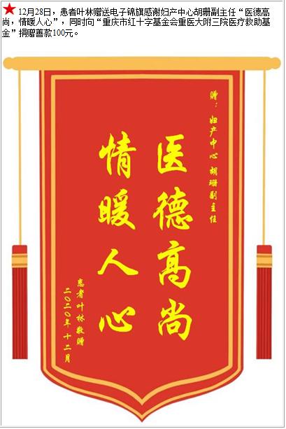 患者叶林赠送电子锦旗感谢妇产中心胡珊副主任,并向医疗救助基金捐赠善款100元-锦旗-患者心声-患者服务-重庆医科大学附属第三医院【官方网站】