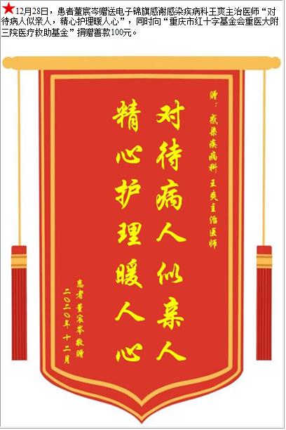 患者董宸岑赠送电子锦旗感谢感染疾病科王爽主治医师,并向医疗救助基金捐赠善款100元-锦旗-患者心声-患者服务-重庆医科大学附属第三医院【官方网站】