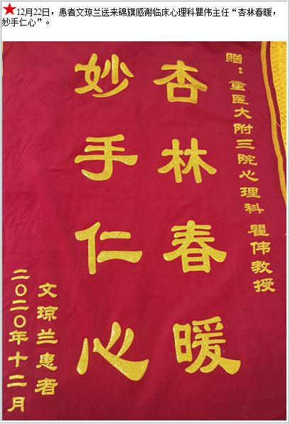 患者文琼兰送来锦旗感谢临床心理科瞿伟主任“杏林春暖,妙手仁心”-锦旗-患者心声-患者服务-重庆医科大学附属第三医院【官方网站】