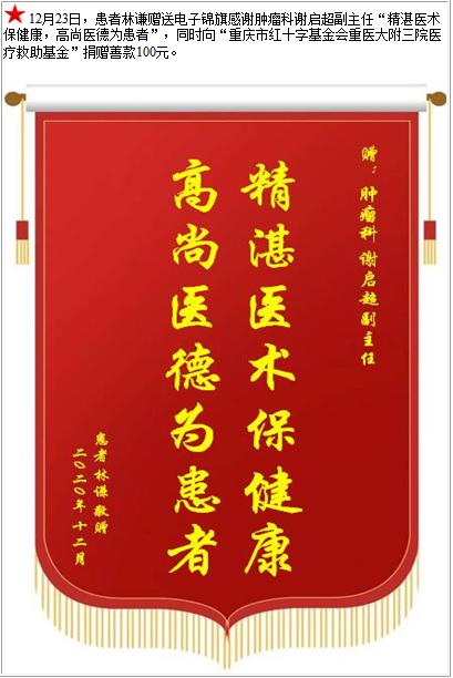 患者林谦赠送电子锦旗感谢肿瘤科谢启超副主任,并向医疗救助基金捐赠善款100元-锦旗-患者心声-患者服务-重庆医科大学附属第三医院【官方网站】