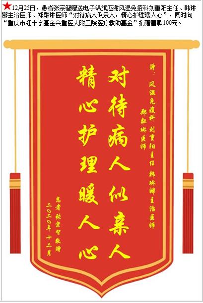 患者张宗智赠送电子锦旗感谢风湿免疫科刘重阳主任等人,并向医疗救助基金捐赠善款100元-锦旗-患者心声-患者服务-重庆医科大学附属第三医院【官方网站】