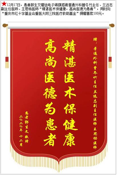患者郭生文赠送电子锦旗感谢普通外科曾冬竹主任等人,并向医疗救助基金捐赠善款100元-锦旗-患者心声-患者服务-重庆医科大学附属第三医院【官方网站】