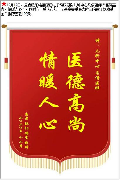 患者欧阳铭玺赠送电子锦旗感谢儿科中心马倩医师,并向医疗救助基金捐赠善款100元-锦旗-患者心声-患者服务-重庆医科大学附属第三医院【官方网站】