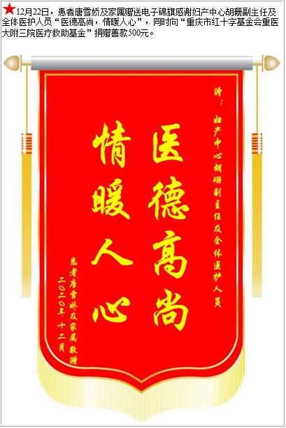 患者唐雪娇及家属赠送电子锦旗感谢妇产中心胡珊副主任及全体医护人员,并向医疗救助基金捐赠善款500元-锦旗-患者心声-患者服务-重庆医科大学附属第三医院【官方网站】