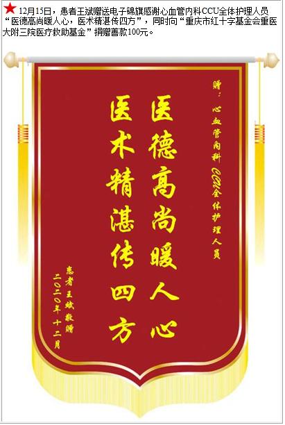 患者王斌赠送电子锦旗感谢心血管内科CCU全体护理人员,并向医疗救助基金捐赠善款100元-锦旗-患者心声-患者服务-重庆医科大学附属第三医院【官方网站】