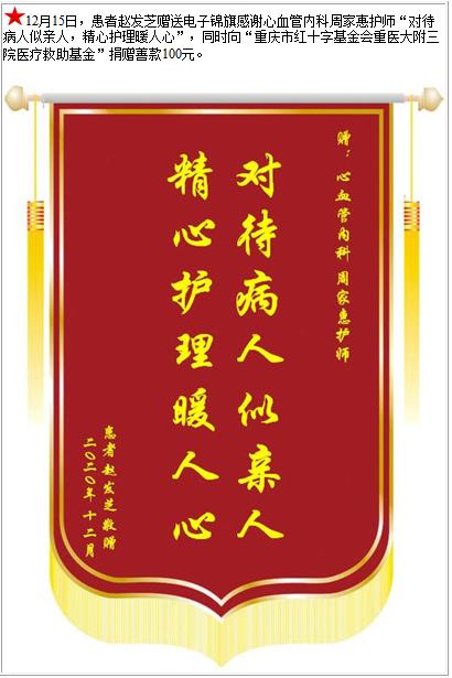 患者赵发芝赠送电子锦旗感谢心血管内科周家惠护师,并向医疗救助基金捐赠善款100元-锦旗-患者心声-患者服务-重庆医科大学附属第三医院【官方网站】