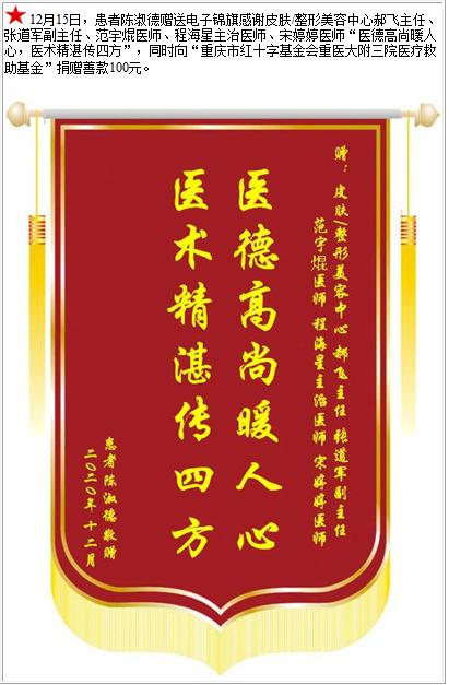 患者陈淑德赠送电子锦旗感谢皮肤/整形美容中心郝飞主任等人,并向医疗救助基金捐赠善款100元-锦旗-患者心声-患者服务-重庆医科大学附属第三医院【官方网站】