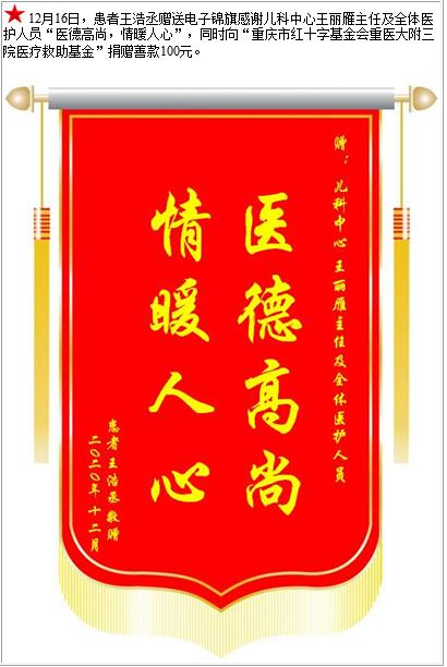 患者王浩丞赠送电子锦旗感谢儿科中心王丽雁主任及全体医护人员,并向医疗救助基金捐赠善款100元-锦旗-患者心声-患者服务-重庆医科大学附属第三医院【官方网站】