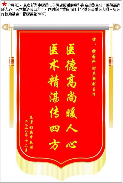 患者彭海中赠送电子锦旗感谢肿瘤科谢启超副主任,并向医疗救助基金捐赠善款200元-锦旗-患者心声-患者服务-重庆医科大学附属第三医院【官方网站】