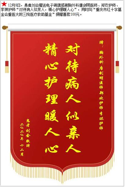 患者刘会赠送电子锦旗感谢胸外科唐剑明医师等人,并向医疗救助基金捐赠善款100元-锦旗-患者心声-患者服务-重庆医科大学附属第三医院【官方网站】