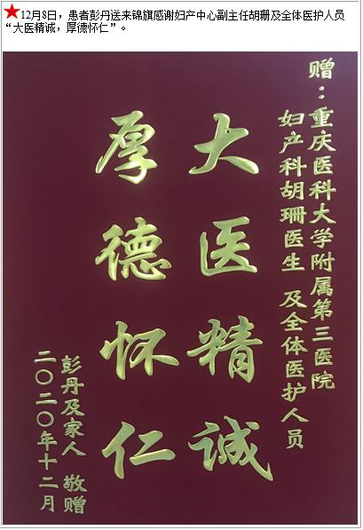 患者彭丹送来锦旗感谢妇产中心副主任胡珊及全体医护人员“大医精诚,厚德怀仁”-锦旗-患者心声-患者服务-重庆医科大学附属第三医院【官方网站】