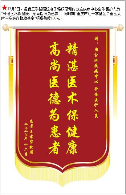 患者王孝碧赠送电子锦旗感谢内分泌疾病中心全体医护人员,并向医疗救助基金捐赠善款100元-锦旗-患者心声-患者服务-重庆医科大学附属第三医院【官方网站】