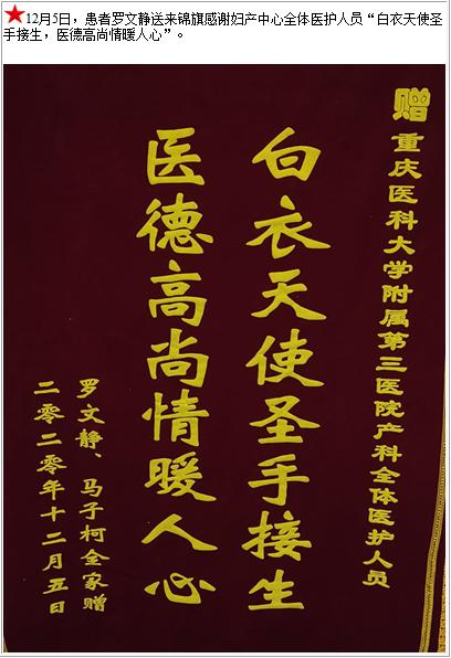 患者罗文静送来锦旗感谢妇产中心全体医护人员“白衣天使圣手接生,医德高尚情暖人心”-锦旗-患者心声-患者服务-重庆医科大学附属第三医院【官方网站】