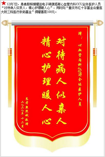 患者殷照娥赠送电子锦旗感谢心血管内科CCU全体医护人员,并向医疗救助基金捐赠善款100元-锦旗-患者心声-患者服务-重庆医科大学附属第三医院【官方网站】