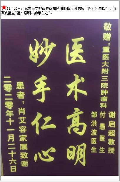 患者肖艾容送来锦旗感谢肿瘤科谢启超主任、付愚医生、邹洪波医生“医术高明,妙手仁心”-锦旗-患者心声-患者服务-重庆医科大学附属第三医院【官方网站】