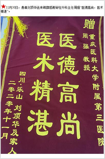 患者刘顶华送来锦旗感谢脊柱外科主任周强“医德高尚,医术精湛”-锦旗-患者心声-患者服务-重庆医科大学附属第三医院【官方网站】