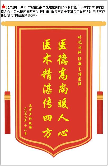 患者卢盼赠送电子锦旗感谢呼吸内科陈敏主治医师,并向医疗救助基金捐赠善款100元-锦旗-患者心声-患者服务-重庆医科大学附属第三医院【官方网站】