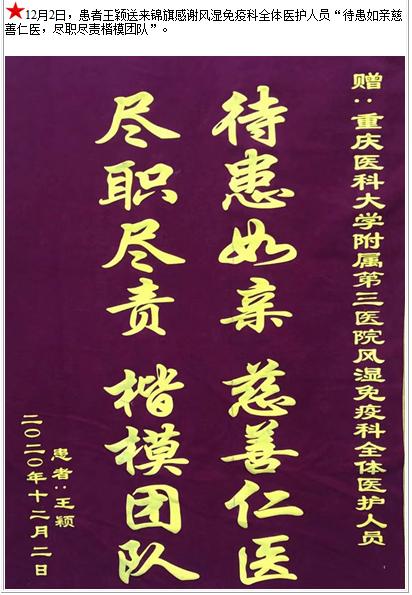 患者王颖送来锦旗感谢风湿免疫科全体医护人员“待患如亲慈善仁医,尽职尽责楷模团队”-锦旗-患者心声-患者服务-重庆医科大学附属第三医院【官方网站】