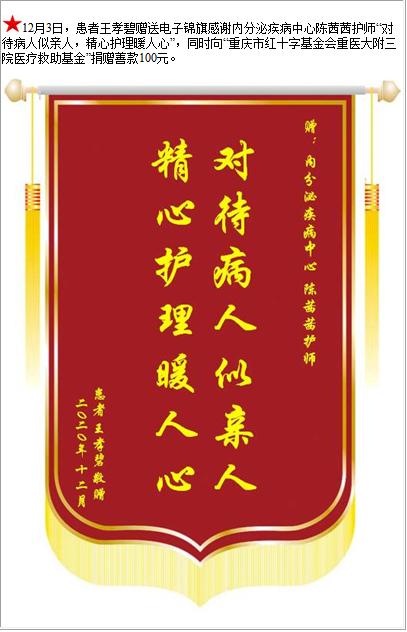 患者王孝碧赠送电子锦旗感谢内分泌疾病中心陈茜茜护师,并向医疗救助基金捐赠善款100元-锦旗-患者心声-患者服务-重庆医科大学附属第三医院【官方网站】