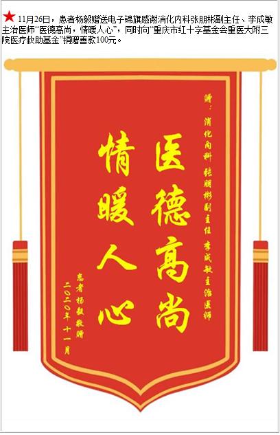 患者杨毅赠送电子锦旗感谢消化内科张朋彬副主任等人,并向医疗救助基金捐赠善款100元-锦旗-患者心声-患者服务-重庆医科大学附属第三医院【官方网站】
