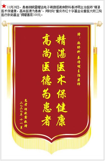 患者胡晓露赠送电子锦旗感谢麻醉科秦诗明主治医师,并向医疗救助基金捐赠善款100元-锦旗-患者心声-患者服务-重庆医科大学附属第三医院【官方网站】