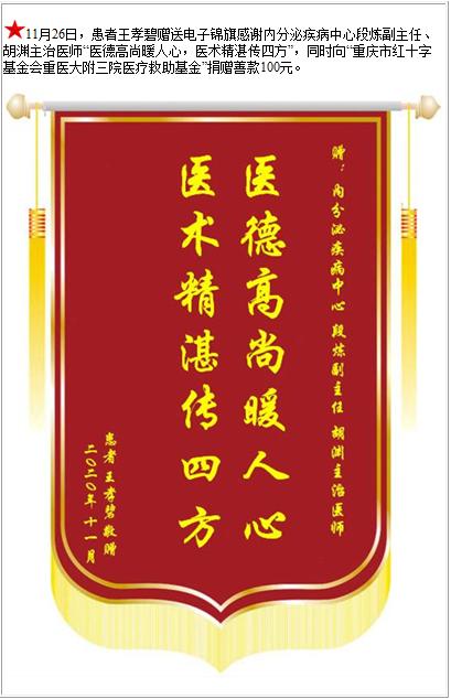 患者王孝碧赠送电子锦旗感谢内分泌疾病中心段炼副主任等人,并向医疗救助基金捐赠善款100元-锦旗-患者心声-患者服务-重庆医科大学附属第三医院【官方网站】