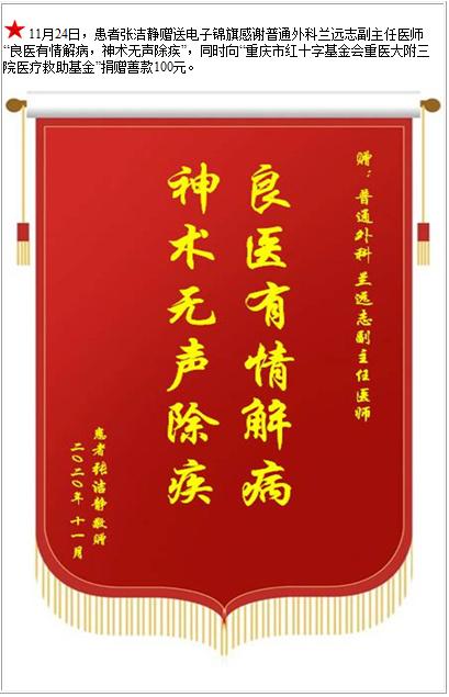 患者张洁静赠送电子锦旗感谢普通外科兰远志副主任医师,并向医疗救助基金捐赠善款100元-锦旗-患者心声-患者服务-重庆医科大学附属第三医院【官方网站】