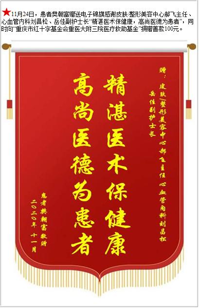 患者樊朝富赠送电子锦旗感谢皮肤/整形美容中心郝飞主任、心血管内科刘昌松等人,并向医疗救助基金捐赠善款100元-锦旗-患者心声-患者服务-重庆医科大学附属第三医院【官方网站】
