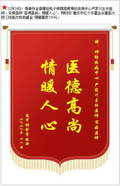 患者张金香赠送电子锦旗感谢神经疾病中心严家川主任医师等人,并向医疗救助基金捐赠善款100元-锦旗-患者心声-患者服务-重庆医科大学附属第三医院【官方网站】