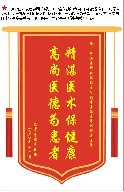 患者曹明秀赠送电子锦旗感谢呼吸内科姚伟副主任等人,并向医疗救助基金捐赠善款100元-锦旗-患者心声-患者服务-重庆医科大学附属第三医院【官方网站】