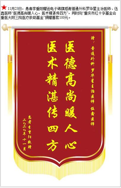 患者李重阳赠送电子锦旗感谢普通外科罗华星主治医师等人,并向医疗救助基金捐赠善款100元-锦旗-患者心声-患者服务-重庆医科大学附属第三医院【官方网站】
