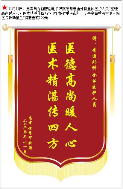 患者黄秀智赠送电子锦旗感谢普通外科全体医护人员,并向医疗救助基金捐赠善款100元-锦旗-患者心声-患者服务-重庆医科大学附属第三医院【官方网站】