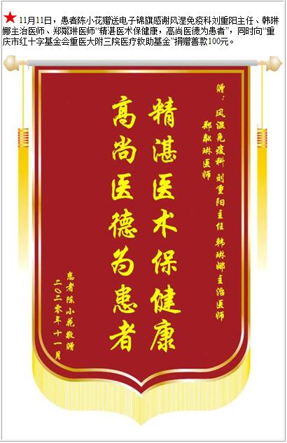 患者陈小花赠送电子锦旗感谢风湿免疫科刘重阳主任等人,并向医疗救助基金捐赠善款100元-锦旗-患者心声-患者服务-重庆医科大学附属第三医院【官方网站】