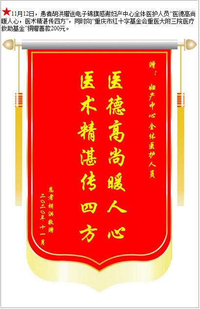 患者胡洪赠送电子锦旗感谢妇产中心全体医护人员,并向医疗救助基金捐赠善款200元-锦旗-患者心声-患者服务-重庆医科大学附属第三医院【官方网站】
