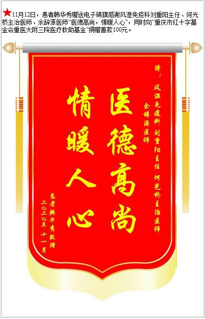 患者韩华秀赠送电子锦旗感谢风湿免疫科刘重阳主任等人,并向医疗救助基金捐赠善款100元-锦旗-患者心声-患者服务-重庆医科大学附属第三医院【官方网站】