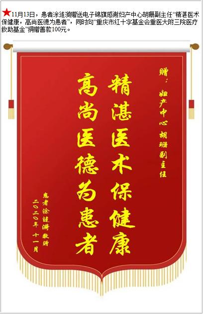 患者涂涟漪赠送电子锦旗感谢妇产中心胡珊副主任,并向医疗救助基金捐赠善款100元-锦旗-患者心声-患者服务-重庆医科大学附属第三医院【官方网站】