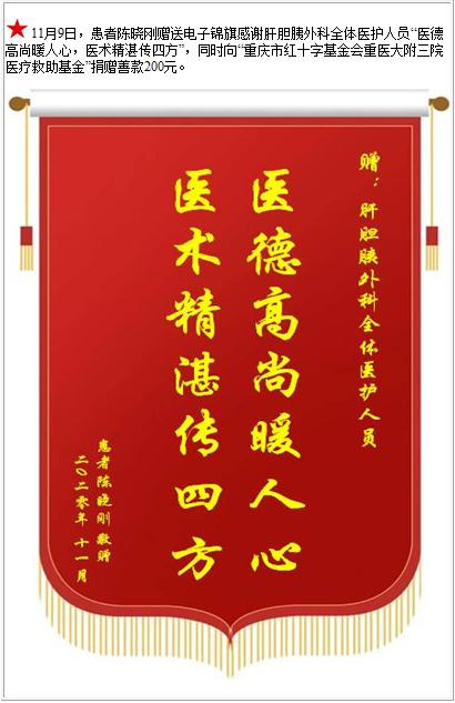 患者陈晓刚赠送电子锦旗感谢肝胆胰外科全体医护人员,并向医疗救助基金捐赠善款200元-锦旗-患者心声-患者服务-重庆医科大学附属第三医院【官方网站】