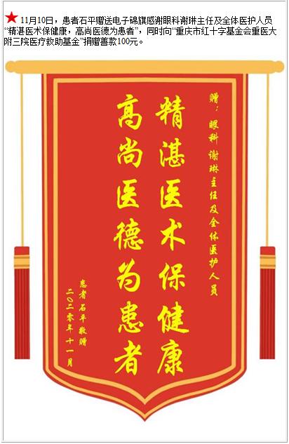 患者石平赠送电子锦旗感谢眼科谢琳主任及全体医护人员,并向医疗救助基金捐赠善款100元-锦旗-患者心声-患者服务-重庆医科大学附属第三医院【官方网站】
