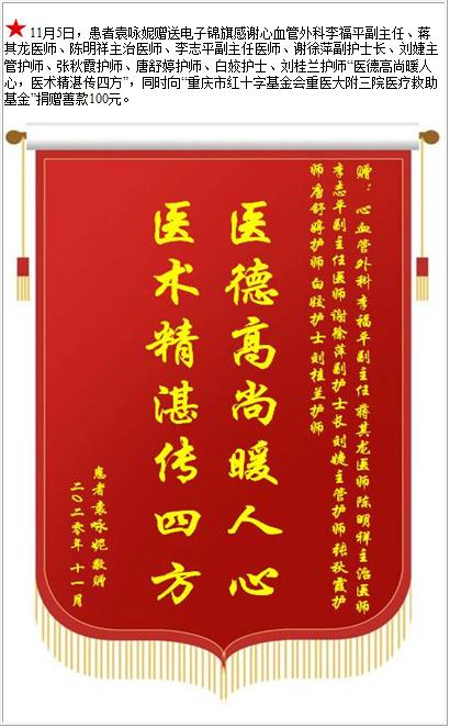 患者袁咏妮赠送电子锦旗感谢心血管外科李福平副主任等人,并向医疗救助基金捐赠善款100元-锦旗-患者心声-患者服务-重庆医科大学附属第三医院【官方网站】